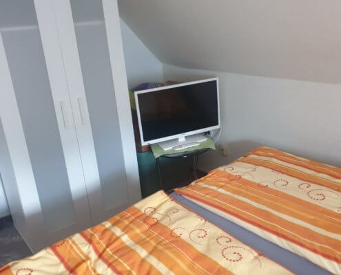 In unserem herrlich holzverkleideten Kaiser’s Landhaus OG befindet sich im Obergeschoss die gemütliche 3-Zimmer-Wohnung. Die rund 75 m² große Ferienwohnung erreichen Sie über zwei Zugänge – über den Steg oder das Erdgeschoss. In der Fewo stehen zwei separate Schlafräume mit je einem Doppelbett und TV-Gerät bereit. Das Wohnzimmer enthält eine Doppelschlafcouch und sorgt mit einem weiteren TV für das Heimkino-Gefühl. Die moderne Einbauküche verfügt über Geschirrspüler, Backofen, Cerankochfeld und Kaffeemaschine. Gleich im Anschluss befindet sich das freundlich eingerichtete Esszimmer. Das kleine und feine Badezimmer ist mit Dusche und WC ausgestattet. In dieser Wohnung profitieren Sie von einem kleinen Südbalkon sowie von einer schicken, überdachten Lounge am Steg-Zugang.